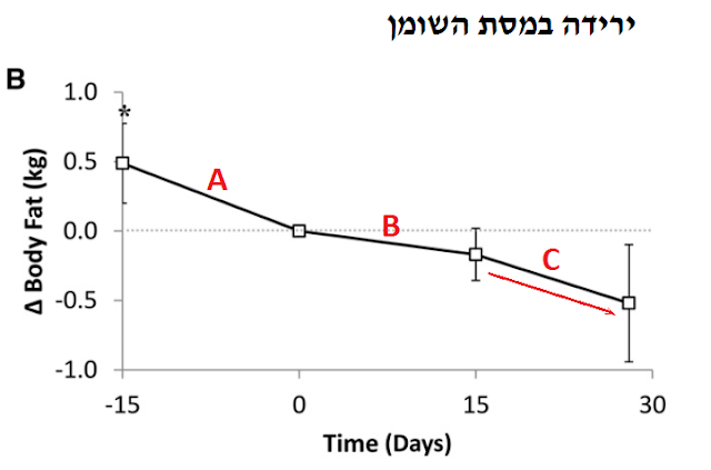 B - השבועיים הראשונים לתזונה הקטוגנית. בשלב הזה ישנה האטה בקצב ירידת מסת השומנים, למרות הירידה המהירה במשקל הכללי שראינו בגרף הקודם. החוקרים כמובן ציפו לירידה חדה יותר.